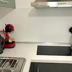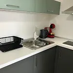 Een complete keuken met een magnetron, een waterkoker en een koelkast is aanwezig in dit appartement, samen met koffie- en theevoorzieningen.